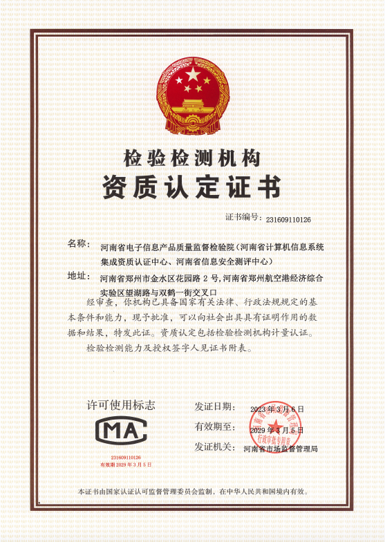河南省电子信息产品质量检验技术研究院是专业从事电子信息产品及信息工程质量监督检验的权威机构,是具有独立法人资格和第三方公正地位的技术服务性事业单位,是中国合格评定国家认可委员会(CNAS)认可的实验室,是通过检验检测机构资质认定(CMA)的第三方检测机构,是河南省编委批准成立的河南省信息安全测评中心,是河南省软件评测中心、河南省电子信息标准化技术委员会,依法开展电子信息产品、电气产品、信息工程质量监督检验,安防工程检验、软件产品评测、信息安全测评、咨询认证以及标准研究与制定等工作。