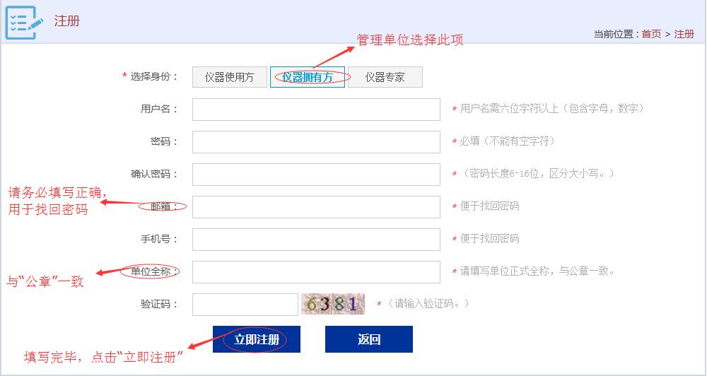 (1)免费注册 管理单位初次使用平台前,应先行注册,在首页用户登录区点击“免费注册”,进入注册页面,选择身份类 型-仪器拥有方,填写信息,点击“立即注册”。如下图所示: