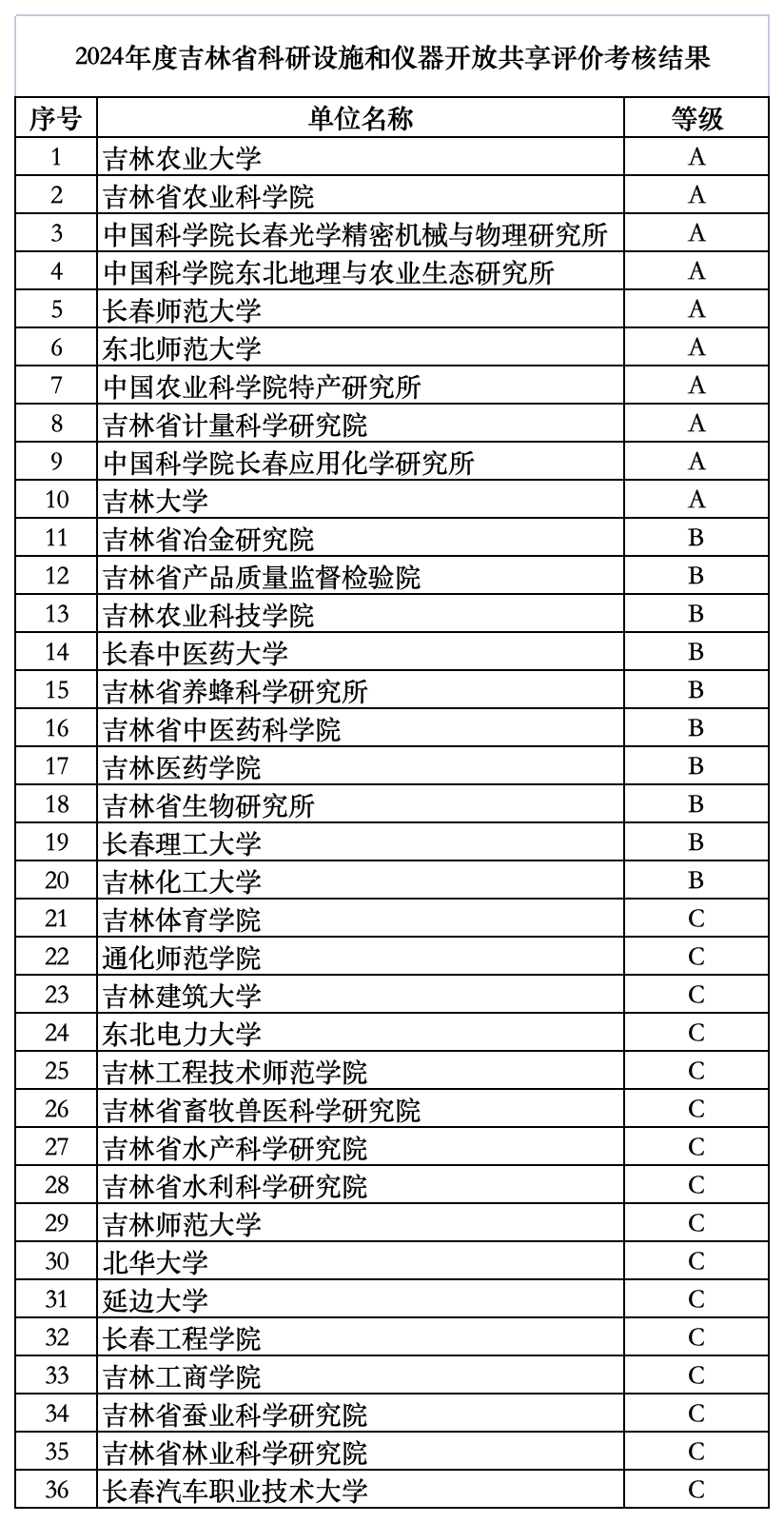 2024年度吉林省科研设施和仪器开放共享评价考核工作已完成。此次参照评价考核指标体系,将评价结果按照A、B、C三个等级评分,其中A为优秀、B为良好、C为合格。现将此次评价考核结果进行公布(见附件)。