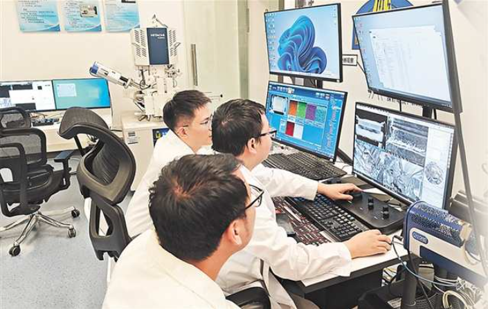 重庆大学分析测试中心工作人员和企业技术人员一起使用聚焦离子束扫描电子显微镜进行新材料开发。(受访者供图)