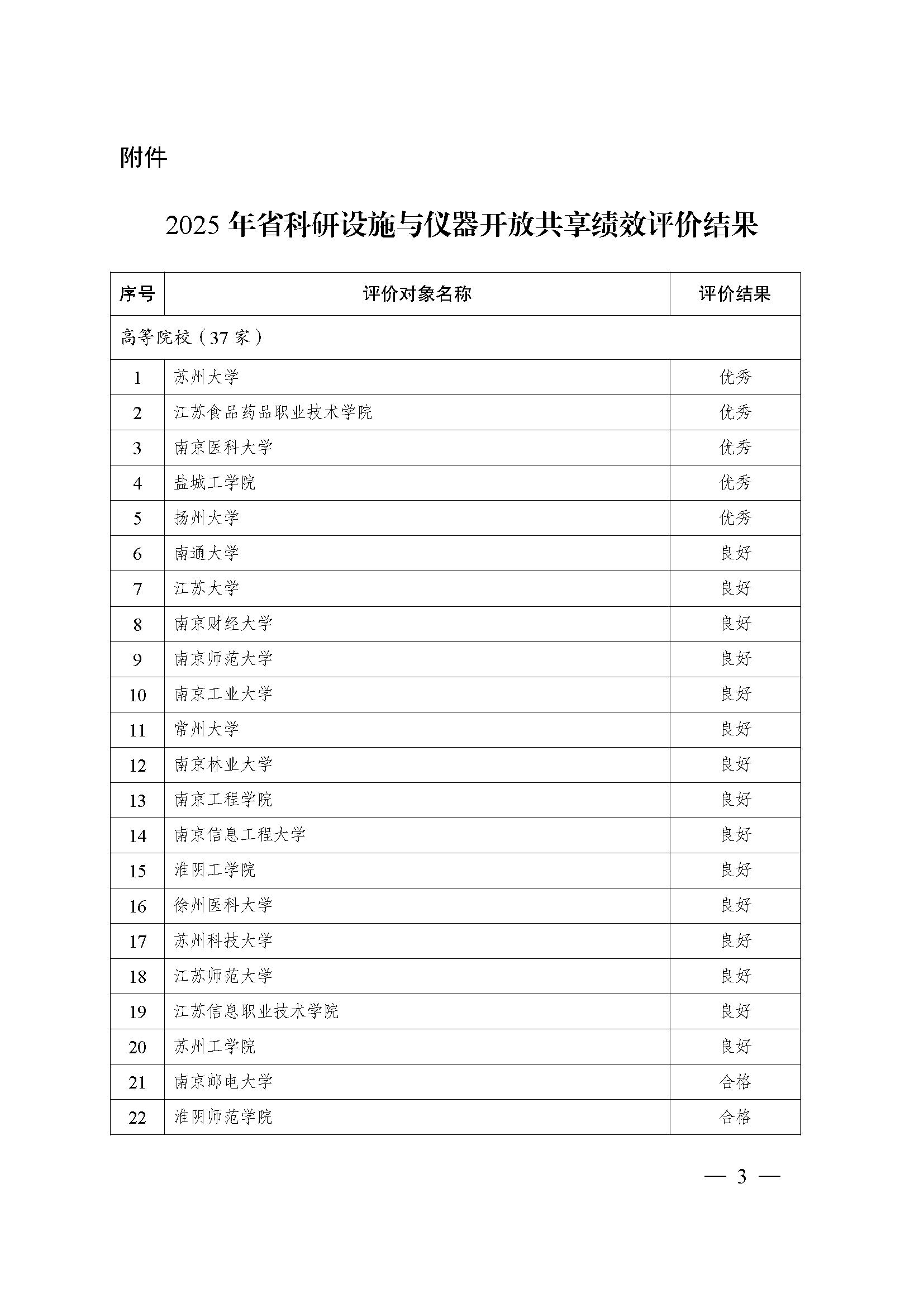 为贯彻落实《国务院关于国家重大科研基础设施和大型科研仪器向社会开放的意见》(国发〔2014〕70号)和《江苏省科学技术进步条例》《江苏省重大科研基础设施和大型科研仪器开放共享管理办法(试行)》(苏科规范〔2024〕3号)等有关规定,按照2025年省科研设施与仪器开放共享绩效评价工作部署,经数据报送、材料审查、数据核查、专家评价等程序,现将评价结果为“合格”及以上等次的评价对象予以公示(详见附件)。公示时间自2025年12月31日至2026年1月7日,公示期间如对公示结果有异议,请向我厅书面反映,凡以单位名义反映情况的材料要加盖单位公章,以个人名义反映情况的材料需具实名并附联系方式。